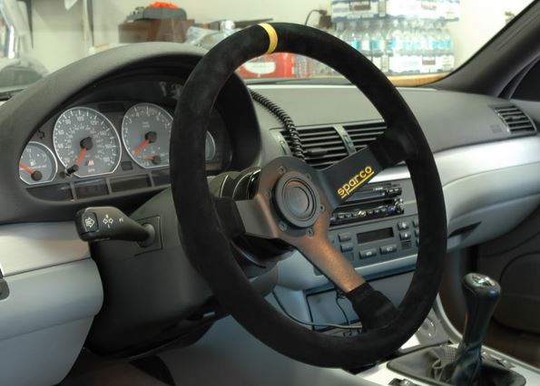 De Sparco R375 is een wild lederen sportstuur met een diameter van 350mm en is vlak (36mm).