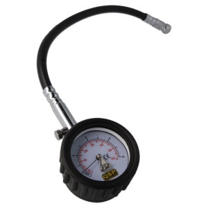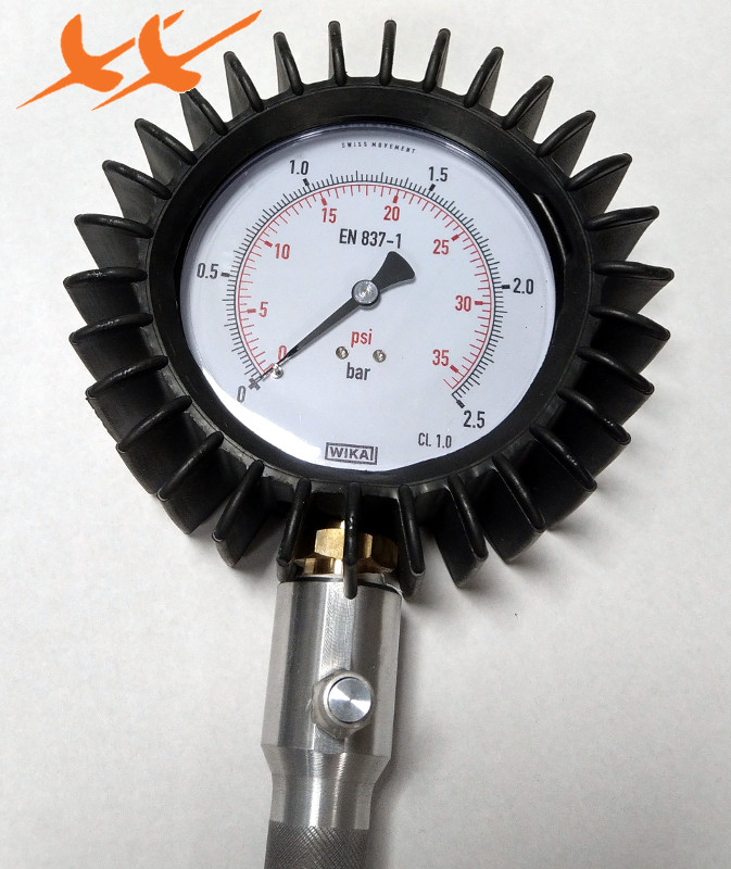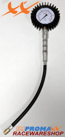 Professionele bandendrukmeter van QSP met grote klok (Ø 9cm) waardoor het zeer goed afleesbaar is en de grote scalering (tot 2,8 bar / 40PSi) maakt deze de ideale partner op het circuit.