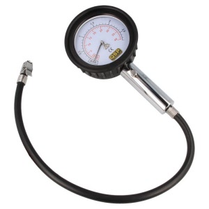 Bandenspanningsmeter nauwkeurig en gefabriceerd volgens ''TUV'' standaard. Metalen behuizing. Heeft een drukaflaat knop om de druk nagebruik af te laten. Schaal is van 0-4 Bar / 0-60 PSI. Wordt geleverd met een kunststof bescherm doos.